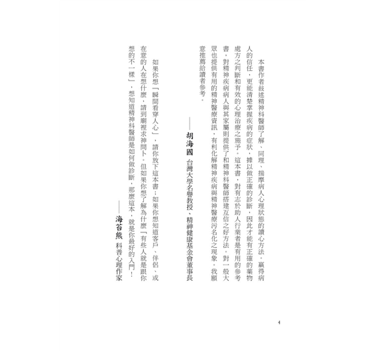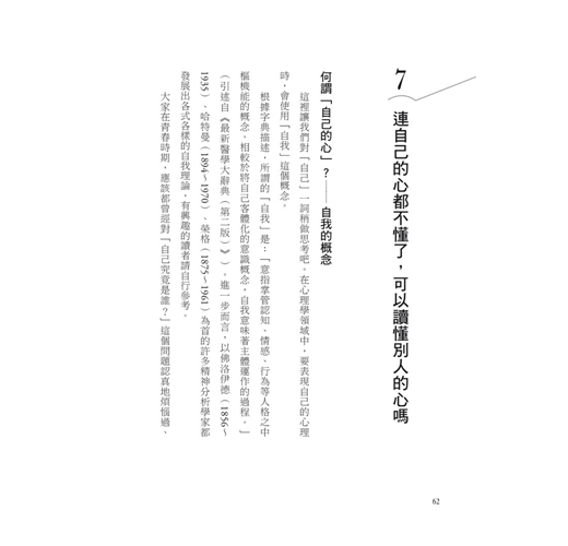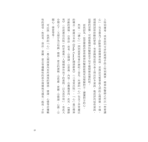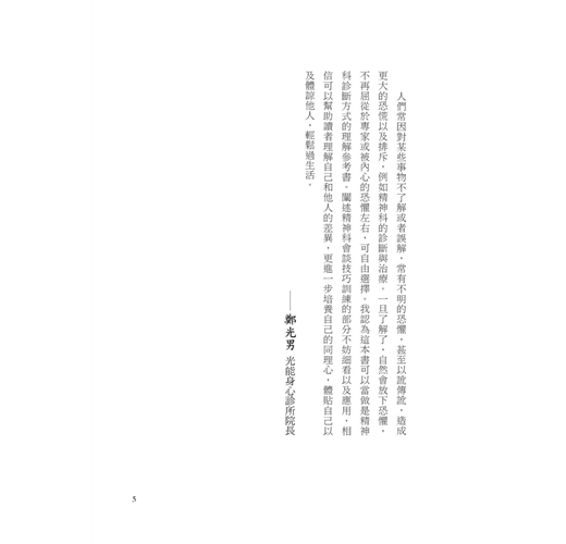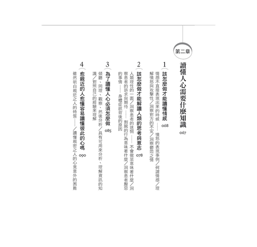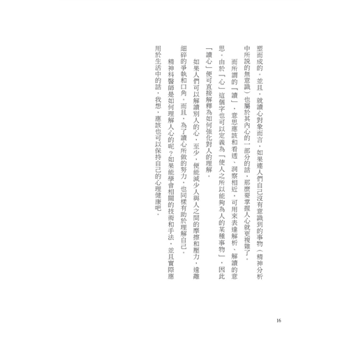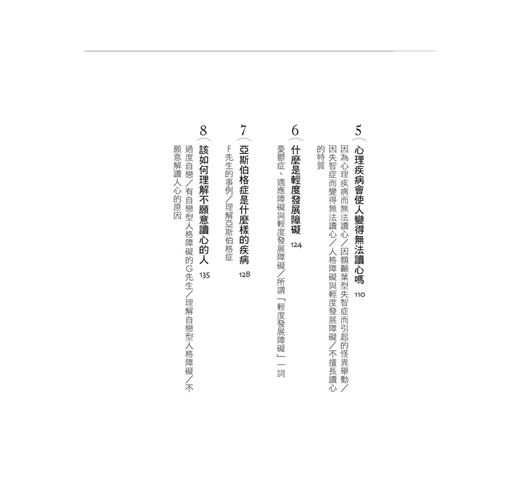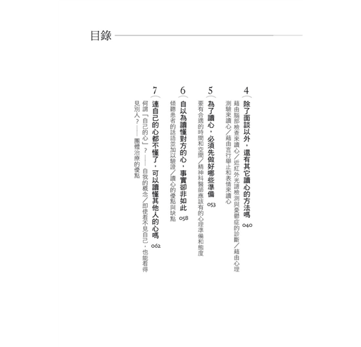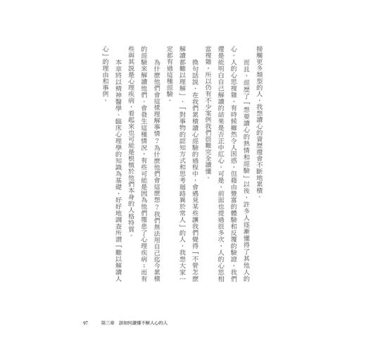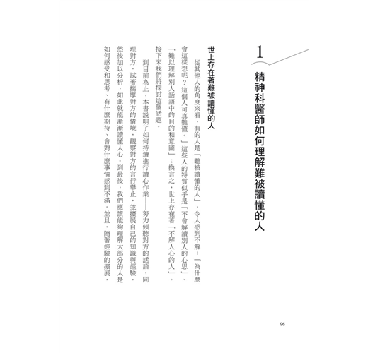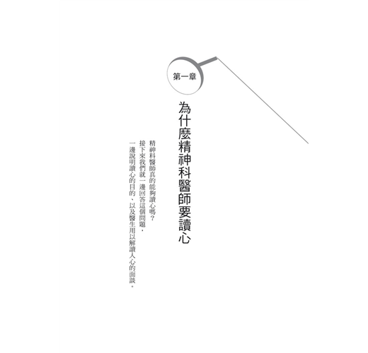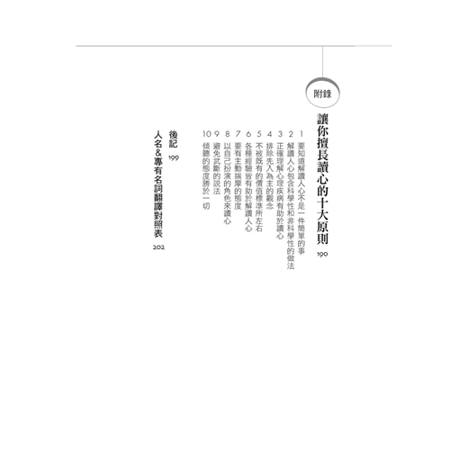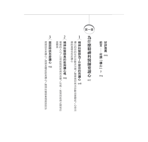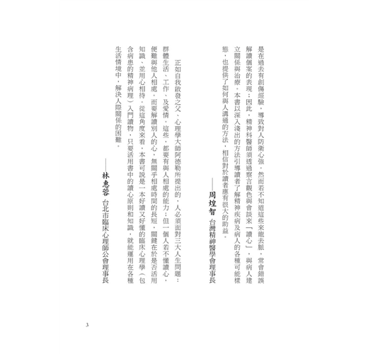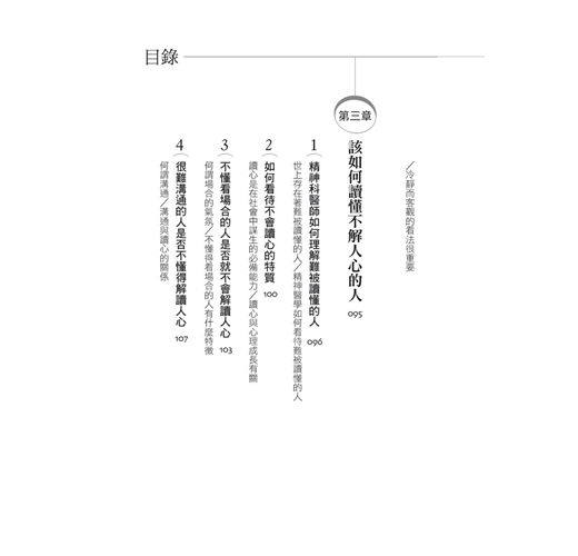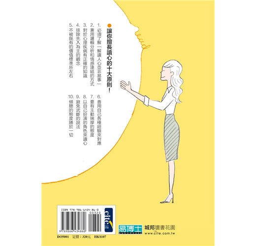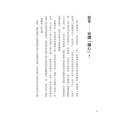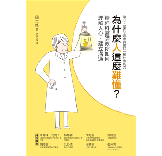 藤本修醫師要告訴你,雖然世上沒有一種萬能的讀心法,但是,只要你懂得應用精神科醫師專業的讀心方式,不管面對什麼樣的人,都能透過聆聽、同理、揣摩、觀察、分析和驗證,順利從看似難懂的言語、行為和身體症狀中,洞悉其人格特質、聽見其真正心聲,從而輕鬆校準自己和對方溝通的頻率,讓你無論在學校、職場、家庭中的人際關係都更加圓融!更棒的是,當你的讀心能力愈純熟,就愈能減少自以為是的誤判,也有助於反過來客觀審視自己的心,體會重新認識自己的樂趣!
