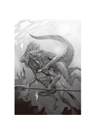 當額圖真把彎刀揮出的那個剎那,法螺號角再度響徹海面上,與之呼應的是游獵民們高亢的呼喊聲,海騎們紛紛彎弓搭箭,勒著韁繩、腳夾蛟龍頸子催動座騎衝刺;巫醫們則首度脫去了華麗的綴飾、縱身躍下水中,額間的松果眼不時飄散出一道又一道肉眼看不見的絢麗閃光;跟隨著他們的族民則一手提魚叉,另一手牽引被蒙住雙眼、共軛著撞錘的蛟龍開始前進並下潛,當蛟龍聳立著的背棘逐漸沒入水面以下,週遭的海水則彷彿陷入低迴的漩渦那般下降、位於背棘前方的水面則有如海浪一般地高突隆起,一道道的白沫圓弧先後在這片海域上浮現、旋即消失無蹤,每一道白沫圓弧都是一具由蛟龍軛著的撞錘。