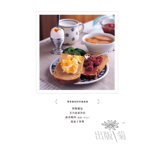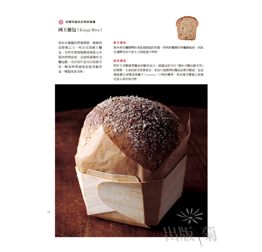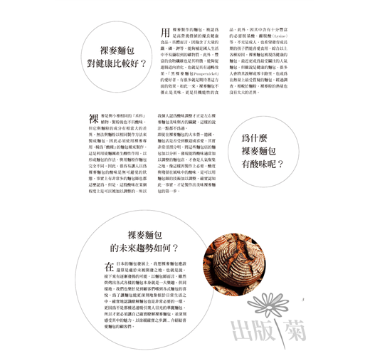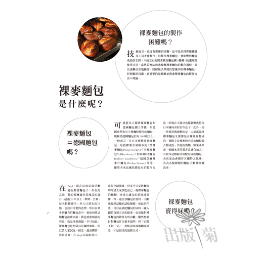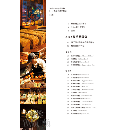 書中從大家對裸麥麵包的為什麼出發,詳細解說目前大家對裸麥麵包一知半解下的疑問,如何品嚐?保存?銷售推廣?進而從酸種的製作方法切入製作與配方。每一道裸麥麵包都有詳盡的對照步驟圖、一看就懂!除此之外,更藉由Zopf獨創的Fixing,設計出與裸麥麵包完美搭配的品嚐法與各種三明治,組合出無限美好的裸麥麵包餐桌風景。