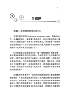 本書主題趨向指標(Directional Movement Index,簡稱DMI)是目前金融市場中,唯一兼具每筆K線最高價、最低價與收盤價之間的相對關係,且能將多空力道分開探討的指標。有鑑於趨向指標在一般書籍討論上,僅著重於基本用法,卻忽略多轉空、空轉多的多空易位技巧,也不見頂底背離觀念的運用。因此,作者興起將核心運用技巧公開的念頭。待讀者熟稔後,如果再配合潮汐、波浪與型態定位,甚至將測量原則合併觀察,無論是在中短線或是中長線架構,都將成為具有參考價值的優秀指標。