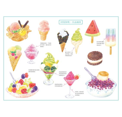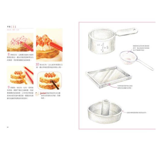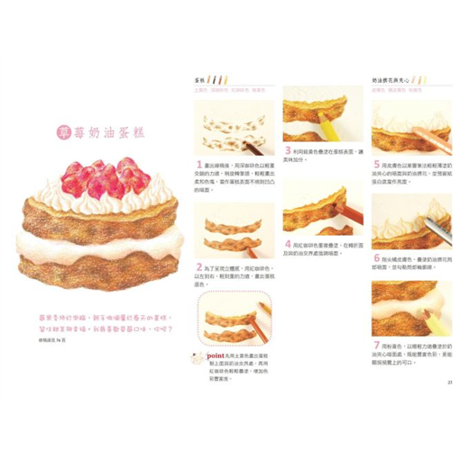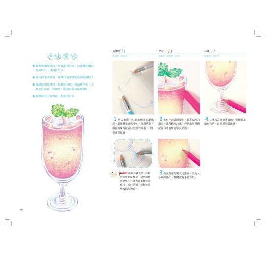 從挑選色鉛筆、紙張、工具,到各式色鉛筆技巧:握筆方式、下筆力道、漸層怎麼畫、利用筆頭尖鈍營造風格、各種有趣的筆法、疊色技巧、簡易幾何形構圖法……等,搭配圖示清楚說解。
