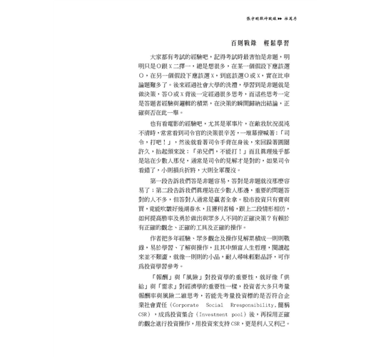 每一波上漲大家都是英雄,一但轉為空頭,就會如同股神巴菲特說的:會看到一堆人光著屁股游泳。股海中的散戶真是辛苦又可憐,總把辛辛苦苦累積的血汗錢在股市一波回檔中輸光,在股市中最可悲的是錢輸光了還沒得到成功的經驗!當今年大盤回檔3000點,市場上只剩下唯一的將軍!我更應該寫一本贏家戰錄來幫助更多需要找到那盞股市明燈的人,衷心希望這101則股市中贏家的實戰戰錄能對您有所助益。