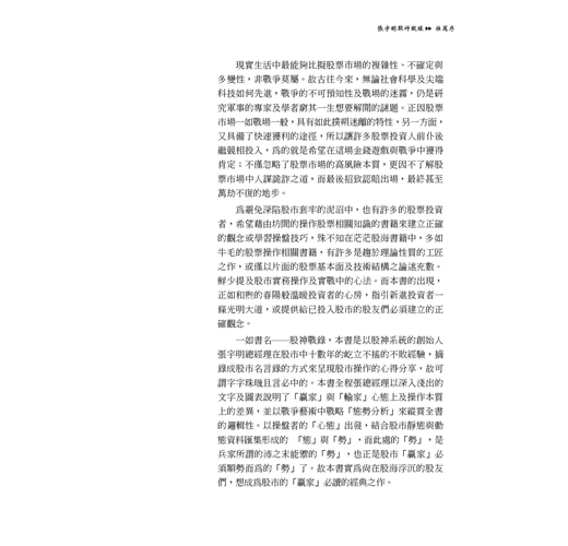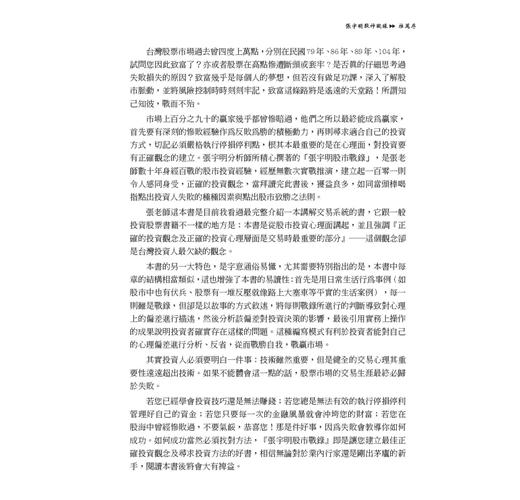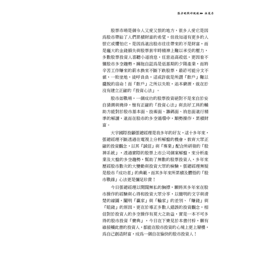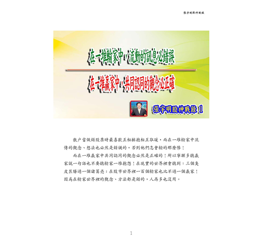 很多人在股市中,終其一生如果你問他是如何做股票的,這些人恐怕回答不出任何問題,因為除了沒工具外,最主要是其基本觀念都錯了,這有如一個人出門,除了沒有一部好車子外,連基本駕駛概念都沒有,那如何在股市中獲利。要知道股市高手眾多,今天你不能超越他,明天就成俎上肉。而這些高手除了掌握一定強大的技巧外,還有一套很嚴謹的紀律與觀念,其中張宇明老師算是箇中翹楚,我有幸與張老師合編此「股市戰錄」也希望給予投資人一些幫助。