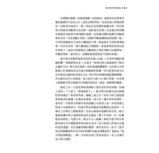 認識老師已經有15年了,這麼長的時間,除了看張老師在判斷大盤非常客觀之外,長期下來正確率極高,尤其在紀律的執行上非常嚴格,幾乎看不到所謂的逆勢操作。當然不可能每筆在操作上都不會出錯,在長期的運作下,要求的是勝率,若以整體勝率來說,張老師可稱投顧業之績優生,這當然除了有股神系統當基本工具外,執行率與紀律才是真正勝負的關鍵。
