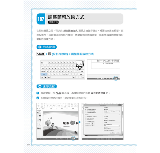 打包字型換台電腦也不怕、壓縮圖片簡報檔瘦身、一次置換簡報字型、搭配旁白錄製成教學影片、放映簡報時重點用滑鼠馬上畫、加點動畫與視訊讓簡報變更威、讓簡報依排練時間自動放映…