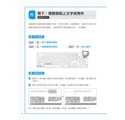 不需要看厚厚一本的操作手冊,本書特別整理出你一定用的到的功能,更開心的是竟然只要用快速鍵就能迅速搞定文書處理、數值試算、簡報展演大小事。