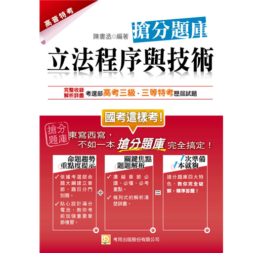 不用通勤跑補習班浪費時間,考用名師幫你把重要考題按照章節及重要度有系統的整理好了!搶分題庫共分八章,各章均先介紹重要且必考的觀念,解題輔以相關法規,協助考生在「立法程序與技術」獲取高分。考生更能搭配考用出版的《觀念式立法程序與技術》融會貫通,相信對應戰實力,絕對有相輔相成的助益。