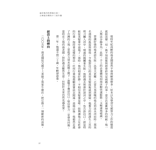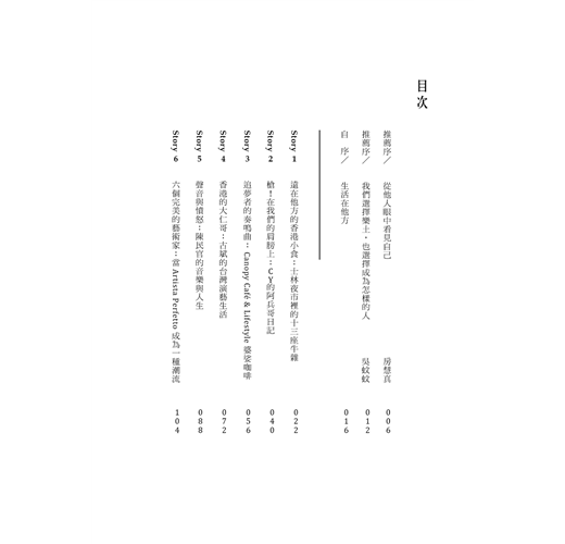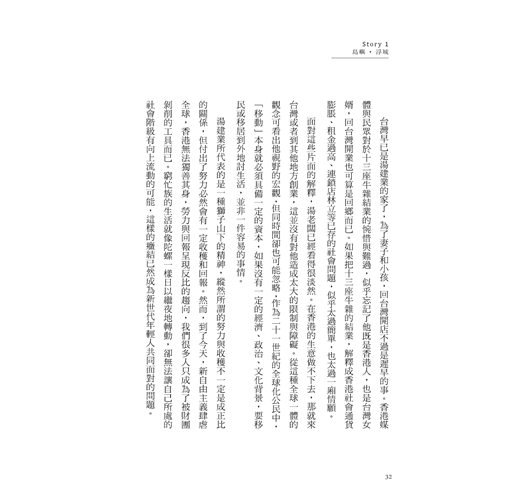 推薦序/從他人眼中看見自己房慧真 推薦序/我們選擇樂土,也選擇成為怎樣的人吳蚊蚊 自序/生活在他方 Story 1遠在他方的香港小食:士林夜市裡的十三座牛雜 Story 2槍!在我們的肩膀上:CY的阿兵哥日記 Story 3追夢者的奏鳴曲:Canopy Café & Lifestyle Story 4香港的大仁哥:古斌的台灣演藝生活 Story 5聲音與憤怒:陳民官的音樂與人生 Story 6六個完美的藝術家:當Artista Perfetto成為一種潮流 Story 7以有涯隨無涯:政大教授蘇偉業 Story 8漫活的創業家:林維源與台北漫步旅店 Story 9飄洋過海的愛情:香港人妻Rosito...