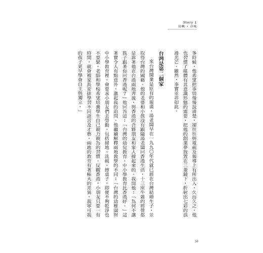 推薦序/從他人眼中看見自己房慧真 推薦序/我們選擇樂土,也選擇成為怎樣的人吳蚊蚊 自序/生活在他方 Story 1遠在他方的香港小食:士林夜市裡的十三座牛雜 Story 2槍!在我們的肩膀上:CY的阿兵哥日記 Story 3追夢者的奏鳴曲:Canopy Café & Lifestyle Story 4香港的大仁哥:古斌的台灣演藝生活 Story 5聲音與憤怒:陳民官的音樂與人生 Story 6六個完美的藝術家:當Artista Perfetto成為一種潮流 Story 7以有涯隨無涯:政大教授蘇偉業 Story 8漫活的創業家:林維源與台北漫步旅店 Story 9飄洋過海的愛情:香港人妻Rositor Story 10打狗上的香江風情:我愛香港茶餐廳 Story 11島國半生緣:李勉之的漫畫人生 Story 12國境之南:我們退休到後灣開民宿 Story 13在島嶼上的放肆輕狂:紅眼的台灣求學與寫作 Story 14巷弄中的青春夢:黑熊港式食閣 Story 15離開是為了回來:自由工作者陳瑄