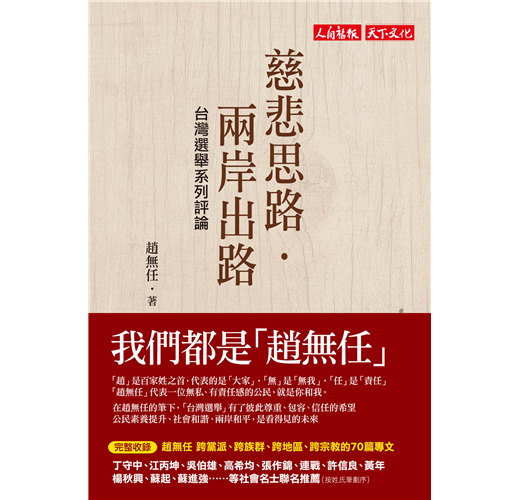 二○一六年總統大選在即,從今年(二○一五)六月底起,《人間福報》每天刊登趙無任針對台灣選舉評論的系列文章,希望為選風增添一些和平、善美的理性思考。如今,這七十篇文章已經刊登完畢,將由高希均教授領導的天下文化公司出版,訂名為《慈悲思路‧兩岸出路──台灣選舉系列評論》。