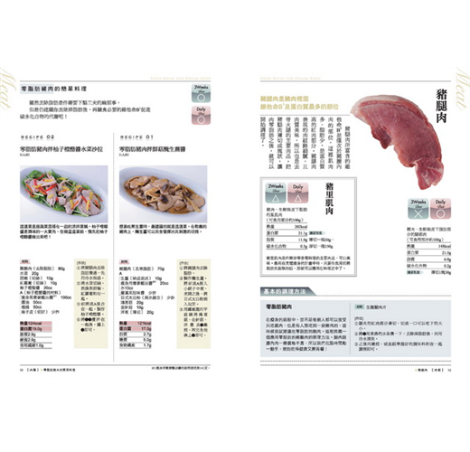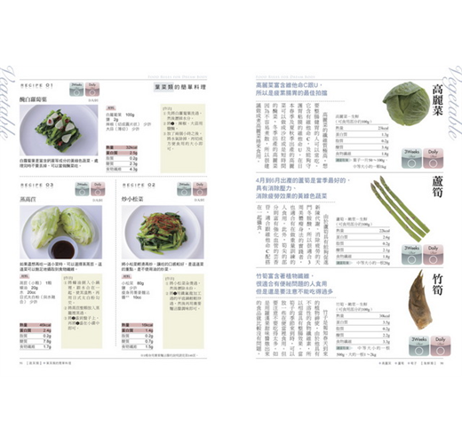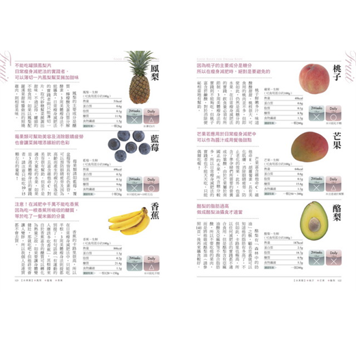 本書共蒐羅24種肉類,22種海鮮類,9種海藻類及乾燥食品,12種葉菜、莖菜類,12種果菜、花菜類,13種香味、其他蔬菜,13種根莖類、豆類、芋頭類,9種菇類及15種水果類,36種其他食材和調味料…等超詳細165種以上瘦身食材分析,單一食材詳細列出蛋白質、脂質、熱量。並以圖示標明3周瘦身法與日常瘦身法是否可食用及可攝食數量,清楚明瞭又好用!還有60種以上的主菜、甜品…超精準瘦身食譜,馬上就可以動手做!