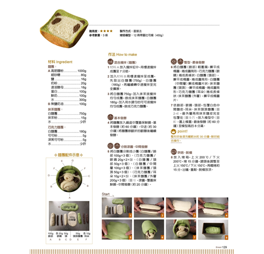 用在地特色食材為佐料;創意造型設計,十足台趣的麵包,如巧克力小熊、菠蘿烏龜、忍者太郎、黑眼貓熊、粉彩瓢蟲等等,讓外觀、造型及口味變化,都成為精緻的人氣麵包。