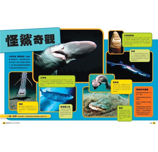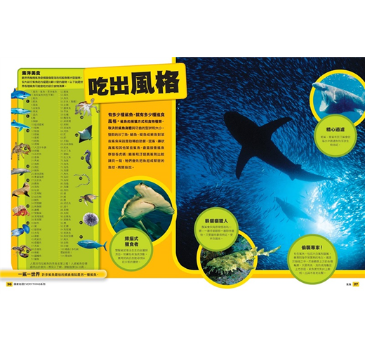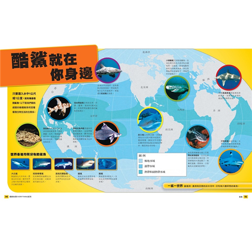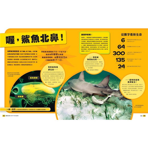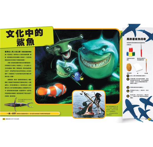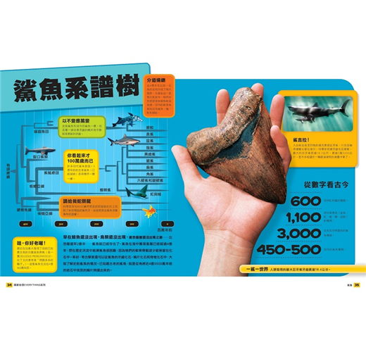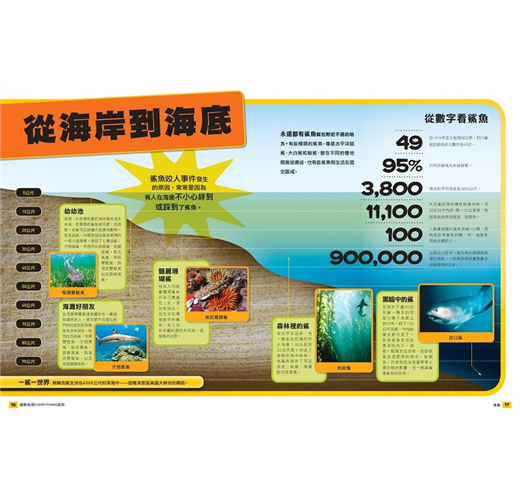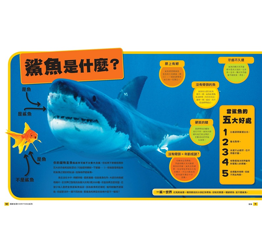 跳脫教科書框架,多元的內容搭配地圖、資訊圖表、超級比一比、從數字看鯊魚、DIY馬鈴薯鯊魚印章、互動式名詞解釋與鯊魚問答,讓孩子輕鬆吸收知識。