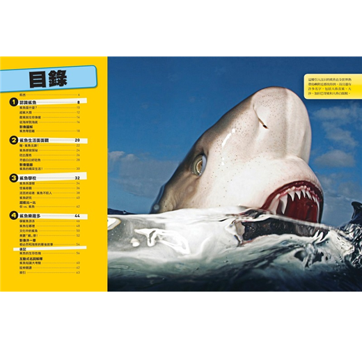 現在,就讓我們深入了解鯊魚,牠們的身體構造、分布地點、捕獵習慣、終結鯊魚咬人的流言、探討與研究文化中的鯊魚。還有有100幅以上國家地理專業攝影師所拍攝的精彩照片,以及「探險家愛分享」專欄,由國家地理探險家與你分享在海中與鯊魚的奇遇。另外還有貫穿全書的趣味知識、地圖、資訊圖表、影像藝廊、超級比一比、幕後花絮、互動式名詞解釋等,各種新奇有趣的鯊魚知識,盡在《國家地理兒童百科 - 鯊魚》!
