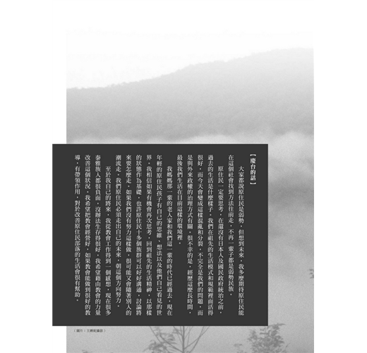 這本書不僅是一位泰雅族人在現實與理想間掙扎、奮起的故事,更是台灣各個原住民族近百年來的努力、挫折與突破的大時代故事。