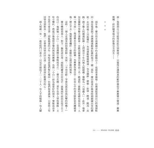 慶台早在場邊看得分明,他以前雖然頑皮,但從來不欺負女生,於是他想也不想就往女學生那裡傳去。在此同時,他覺得肚子彷彿遭到鐵鎚重敲一擊,整個人向後直飛出去,落地前又再被鏟起,這次像是背部遭到挖土機朝空中鏟去。他很害怕,想要伸出手抵住地面,但是不行,一群人把他圍在中央,開始拳打腳踢,慶台只能出於反射伸手護住頭臉。這時,除了聽見骨頭遭到重擊的聲音,還聽見一個陌生的名詞:蕃仔。