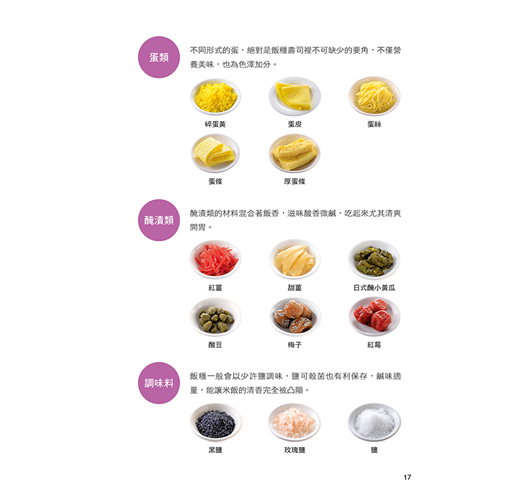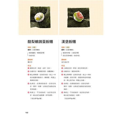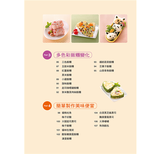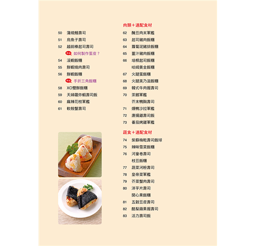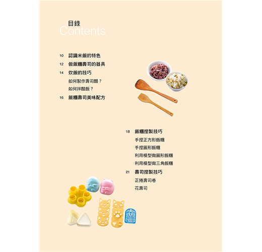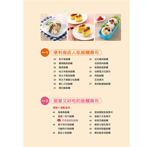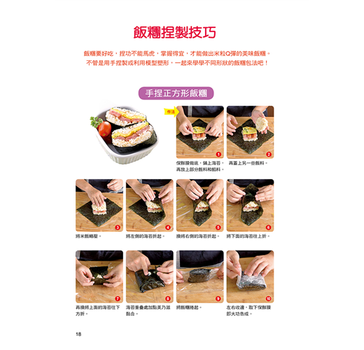介紹多種飯糰(正方形、三角形、圓形、圓餅形等)和壽司(正捲壽司卷、花壽司)的捏製技巧,適合全家人一起享受手作的樂趣。