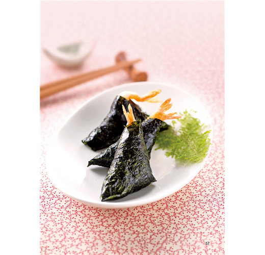 4 先將左、右兩側的海苔,分別往內折,整形,包緊,沾點美乃滋黏住海苔交接處。