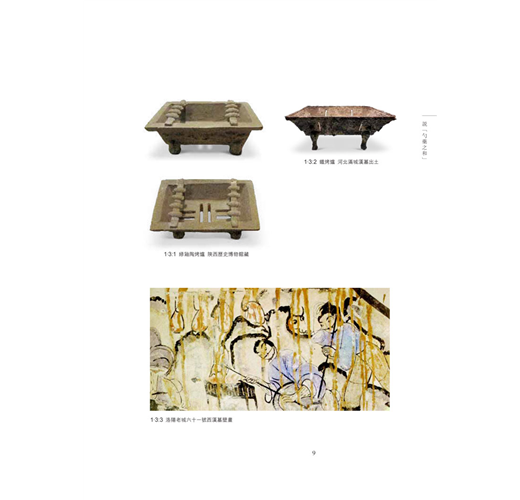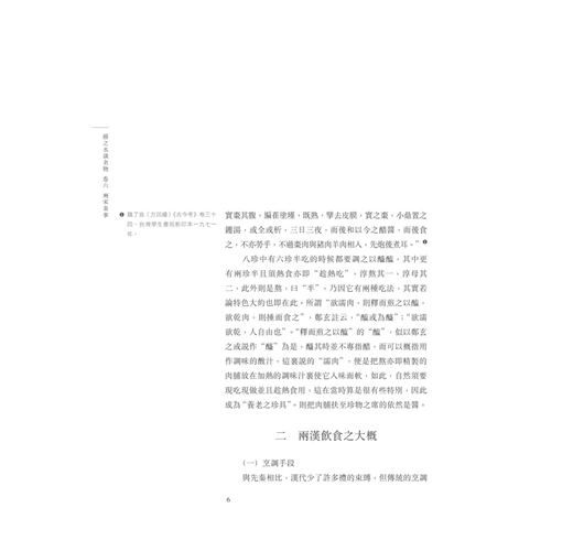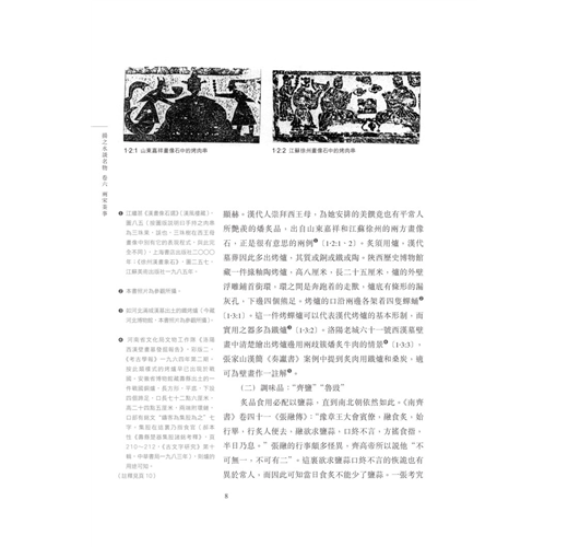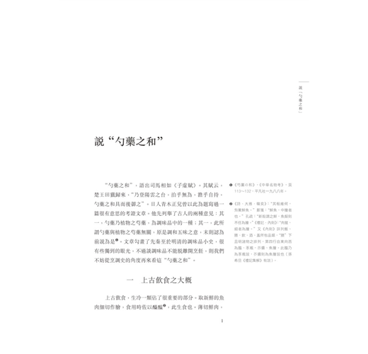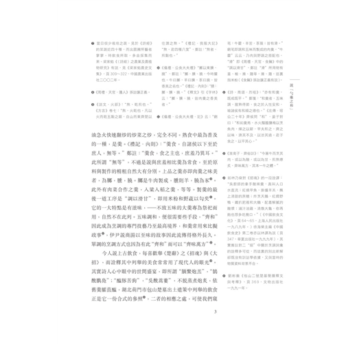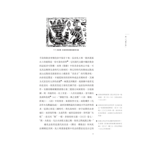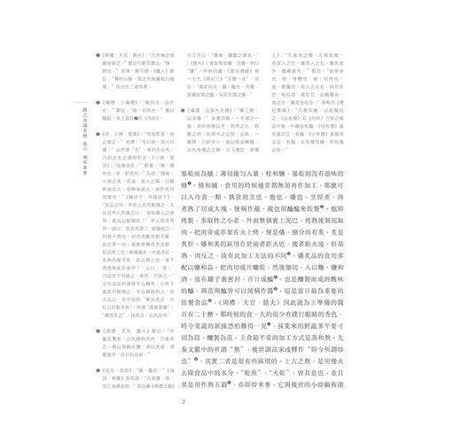 上古飲食,生冷一類佔了很重要的部分。取新鮮的魚肉細切作膾,食用時佐以醯醢,此生食也。薄切鮮肉,暴乾而為脯;薄切後勻入薑、桂和鹽,暴乾則為有滋味的脩。脩和脯,食用的時候通常都無須再作加工,那麼可以入冷食一類。熟食則烹也,炮也,燔也。烹即煮,肉煮熟了切成大塊,便稱作胾,胾也須醯醢來佐餐。炮即烤製,多取牲之小者,外面整個裹上泥巴,烤熟後剝泥取肉。把肉穿成串架在火上烤,便是燔,細分尚有炙,炙是炙肝。燔和炙的區別在於前者距火近,後者距火遠,肝易熟,肉反之,故有此加工方法的不同。燔炙品的食用多配以鹽和蒜。把肉切成片曬乾,然後細切,入以麴、鹽和酒,放在罐子裏密封,百日成醢。也是釀製而成的酸味的醯,與菹與醢皆可以統稱作醬,這是當日最為重要的佐餐食品,《周禮.天官.膳夫》因此說為王準備的醬百有二十罋。那時候的食,大約很少有撲打眼睛的秀色,時令菜蔬的新綠恐怕難得一見,採集來的野蔬多半要寸切為段,釀製為菹。主食最平常的加工方式是蒸和熬。先秦文獻中的所謂“熬”,後世訓詁家或釋作“即今所謂炒也”,其實二者是很有些區別的。上古之熬,是用慢火去除食品中的水分,“乾煎”,“火乾”,皆其意也,並且多是用作熬五穀,亦即炒米麥。它與後世的小炒鍋佈滾油急火快速翻炒的炒菜之炒,完全不同。熟食中最為普及的一種,是羹。《禮記.內則》:“羹食,自諸侯以下至於庶人,無等。”鄭註:“羹食,食之主也,庶羞乃異耳。”此所謂“無等”,不過是說與庶羞相比羹為常食,至於原料與製作的精粗自然大有分別。上品之羹亦即肉羹之味美者,為膷,臐,膮。膷是牛肉製成,臐則羊,膮為豕。此外有肉菜合作之羹,入粱入稻之羹,等等。製羹的最後一道工序是“調以滑甘”,即用米粉和野蔬以勾芡。它的一大特點是有滋味, ── 不致五味的大羹專為祭祀而用,自然不在此列。五味調和,便很需要些手段,“齊和”因此成為烹調的專門技藝乃至最高境界,和羹常用來比擬政事,伊尹說商湯以至味的故事因此流傳得格外長久。單調的烹調方式也因為有此“齊和”而可以“齊味萬方”。