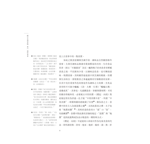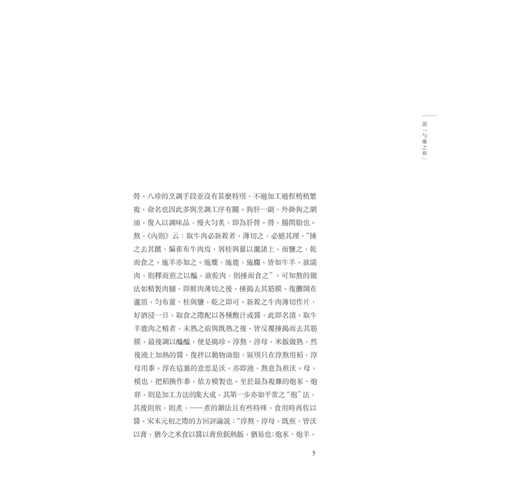 如此之飲食結構與烹調手段,調味品自然顯得格外重要。大部分調味品都兼有殺菌解毒的功用,生冷食品居多,固以“不撤薑食”為宜。醯與梅子於肉食者有解膩消食之效,平民鮮肉少菜,以調味品佐食,也可聊助滋味,稍潤清寡。其時雖然遠遠談不到烹調的精緻,但禮與生活的合一卻使飲食之事處處都有仔細鄭重的安排。在其中充任重要角色的便是作為調味之主的醬。烹炙品食用時不可缺少醯醢,《詩.大雅.行葦》“醓醢以薦,或燔或炙”,其事也。凡盛饌設食,皆餚與醬相間,不同的餚亦即胾和炙,必要配以不同的醬,《禮記.內則》對此規定得至為詳盡。孔子說“不得其醬不食”,所謂“不得其醬”,即醬與餚的搭配錯了位置。醬為食之主,食禮中因有主人為賓設醬之儀,又因此養老之禮,天子也要“執醬而饋”。其時庶羞的食用曰“濡”曰“染”,均指蘸醬,食禮中對此都有詳細的規定,“設醬”與“執醬”也因此能夠成為表示敬意的一種特殊方式。