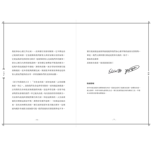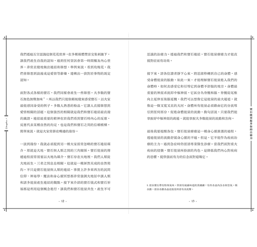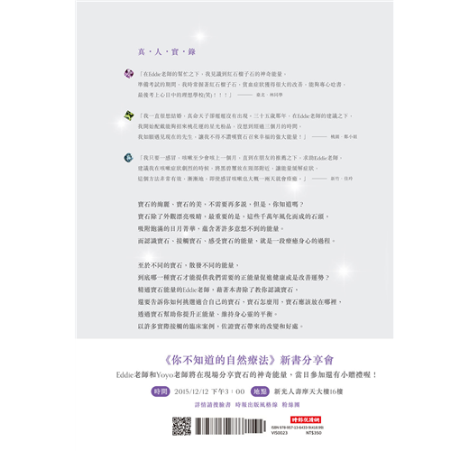 至於不同的寶石,散發不同的能量,到底哪一種寶石才能提供我們需要的正能量促進健康或是改善運勢?精通寶石能量的Eddie老師,藉著本書除了教你認識寶石,還要告訴你如何挑選適合自己的寶石,寶石怎麼用,寶石應該放在哪裡,透過寶石幫助你提升正能量、維持身心靈的平衡。以許多實際接觸的臨床案例,佐證寶石帶來的改變和好處。