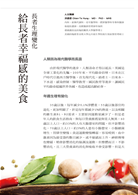 此書結合醫師、營養師及廚師的專業意見,涵蓋許多關於長者在年老時身體會產生的身心理變化以及飲食上可能碰到困難,並由營養師分享健康食譜、廚師分享烹調心得,讓讀者在享受少油少鹽的美食、保持健康體重之餘,學習如何閱讀營養標示,適應新的飲食方式。