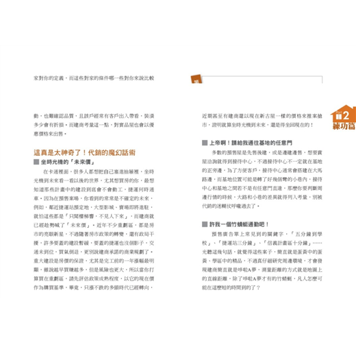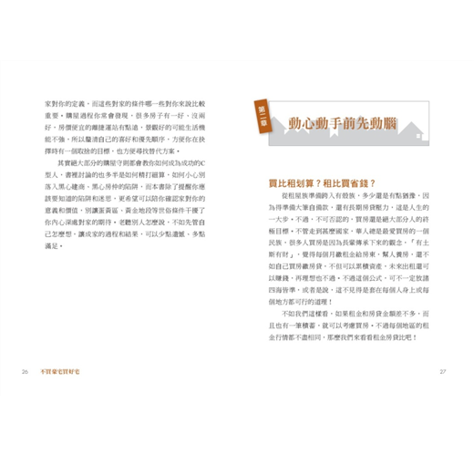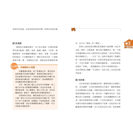 現在,跟著台灣房屋智庫發言人張旭嵐的腳步,一步一步,抽絲剝繭地展開買屋置產所需的前置作業,培養最基本的專業知識,然後透過實地勘查經驗的積累,不消多久的時間,你絕對可以成為房地產界的專業人士;從消極面來看,往後不必再怕遇到糾紛,慘遭欺騙,從積極面來看,則可以談到好價錢,買到好的起家厝。
