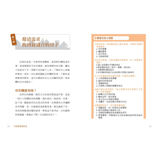 買房置產是人生大事,但是隨著生活富裕、資金充沛,房子不僅是遮風避雨的地方,更是累積資產的管道,是投資理財的標的,目的多元,當然購屋的眉眉角角也越來越多。地點的考量,增值空間,學區、交通,社區公設,建材,座向,景觀……自己的、另一半開的條件需求寫得眼花撩亂,長輩的、專家的建議,多得如排山倒海,在加上原本就沉重的房屋價格,買屋就成了人生最不可承受之重,買屋之路顯得漫長而艱辛。