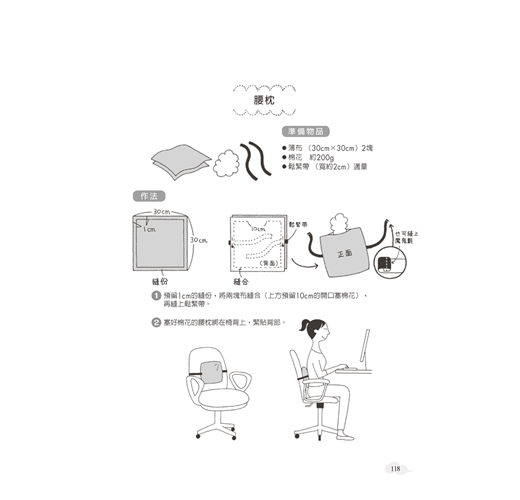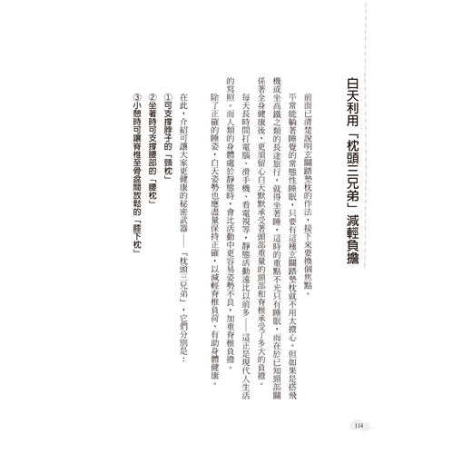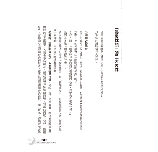 2、提供簡單實用、符合個人的枕頭挑選法,並且大方公開枕頭價位、好壞,以及手工枕、頸枕、腰枕、膝下枕、玄關踏墊枕等各類具有「療效」枕頭的優缺點與判別方式。