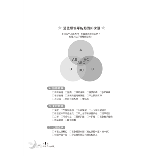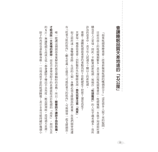 1、作者為枕頭專門醫師,以其多年行醫經驗中所遇到實際案例,說明一般人常見的睡眠障礙與枕頭、健康的關係,文字生活化,並配合圖表解說,絕對淺顯、易懂、好理解,也易於讀者用來自我檢視自身小毛病是否為睡眠問題所造成。