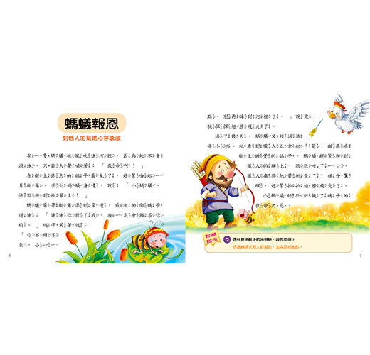 1、 精選北風和太陽等小故事,透過精美的圖畫、簡單的文字讓孩子想要一讀再讀。2、 每篇故事皆有品格小語,可幫助理解故事寓意,學習正確觀念。3、 配合故事主題,設計有趣的Q&A問答題,以輕鬆對談方式,讓孩子主動思考問題。