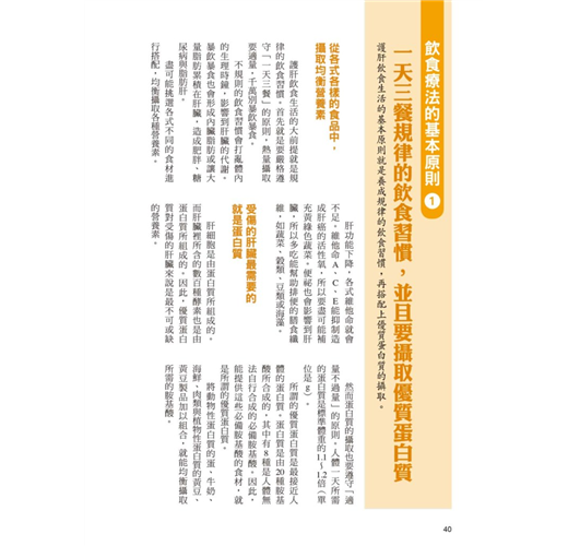 在營養均衡飲食的原則下,此書為讀者不單只設計三餐多樣化的料理,還有西式、亞洲料理的選擇,對於主菜類(主要良好蛋白質來源)的設計,也提供肉類、海鮮類、蛋類以及黃豆類多款不同的烹調食譜,而蔬菜類的料理,也以黃綠色、根莖菜類、菇類的分類法,讓讀者可以照圖簡易製作出一道好吃又美味的護肝料理。