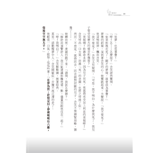 他輕吸一口氣,啟唇,低低吟著:「在夢為實;於覺是幻。夢裡明明有六趣,覺後空空無大千。」