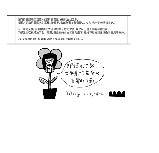 而玫怡說:「回到台灣的我真的太開心了,即使必須為了建立自己的經濟獨立能力而非常忙碌、勞累、活得節拮、擔憂,這一切好壞我都把它們包在開心裡面。二一○六年我還是要好好創作,不放棄自由創作的自已。即使到了五十歲也要是一支花般的,美麗的活著。」