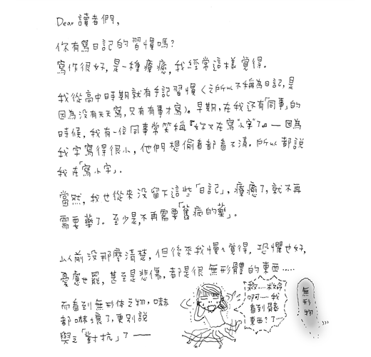 具備漫畫家身分的作家,擅用圖文書寫的方式自由揮灑,1998年起與徐玫怡兩人首度以《交換日記》手寫體而大受喜愛,因而開啟兩人聯手交換日記的合作創作,超過18年而不衰,至今兩人已共寫18本交換日記。