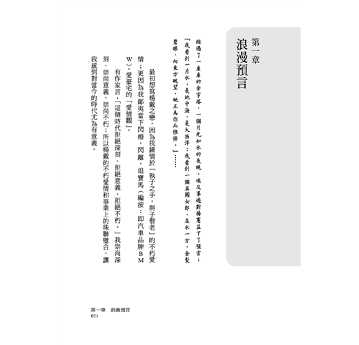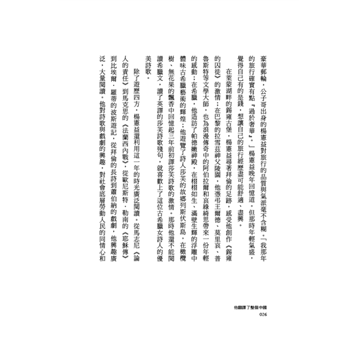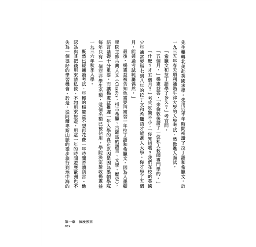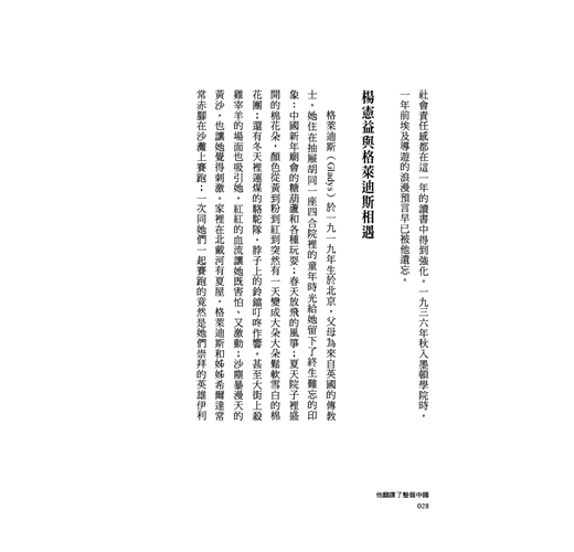果然,二十歲的楊後來在牛津大學莫頓學院遇見了Gladys(戴乃迭),從此展開了兩人高潮迭起的精采人生。Gladys為了愛,不顧母親勸阻,跟隨楊憲益來到動盪的中國。他倆是倚天劍與屠龍刀,二人刀劍合體攜手在翻譯事業上交出了令人驚嘆的傲人成績。紅樓夢、資治通鑑、楚辭、儒林外史......一本本經典英譯相繼出版,幅度之廣,品質之佳,在國際間獲得了高度的評價。