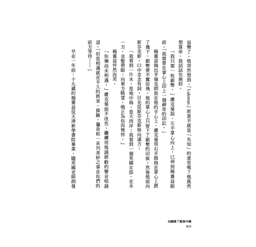 但看這本《他翻譯了整個中國》時,心酸的是譯者竟然沒有選擇要不要譯,要怎麼譯。上級叫他們翻譯甚麼,他們就得翻譯,中間還入獄多年,出來繼續翻譯,譯稿還得經過政治審查,還有一堆難以討好的紅學專家等著挑毛病。在這樣肅殺的氛圍下,譯者哪裡還能奢談甚麼翻譯策略,只求不出錯就謝天謝地了罷。難怪楊氏不少譯本都帶有一點公務員的匠氣,也算是譯者的無言抗議吧。