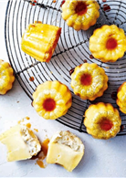 準備好雞蛋、牛奶、麵粉、融化的奶油和糖,拿出打蛋器,打一打、攪一攪,倒進烤模、送進烤箱,完成。
