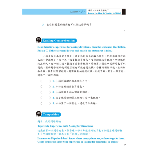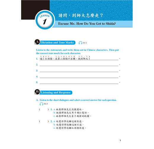 The field of L2 Chinese in Taiwan seems to have adopted the world-famous 'one child policy'. The complete set of currently used textbooks was born a generation ago, and until now has been without predecessor. We are happy to fill this vacancy, and with the title ‘number two’, yet we also aspire to have it be number two in name alone. After a generation, we present a slightly disciplined contemporary language as observed in Taiwan, we employ Hanyu Pinyin without having to justify it cautiously and timidly, we are proud to present a brand-new system of Chinese parts of speech that will hopefully eliminate many instances of error, we have devised two kinds of exercises in our series, one basically structural and the other entirely task-based, each serving its own intended function, and finally we have included in each lesson a special aspect of Chinese culture. Moreover, all this is done in full color, the first time ever in the field of L2 Chinese in Taiwan. The settings for our current series is in Taipei, Taiwan, with events taking place near the National Taiwan Normal University. The six volumes progress from basic colloquial to semi-formal and finally to authentic conversations or narratives. The glossary in vocabulary and grammar is in basically semi-literal English, not free translation, as we wish to guide the readers/learners along the Chinese 'ways of thinking', but rest assured that no pidgin English has been used.