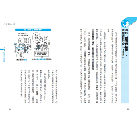 在對話中誘導對方的方法之一是「成套肯定法」(Yes Set)。「電車來了,上車吧」、「在這一站換車比較快吧?」等,重複說這類容易回答「是」的問題。這種心理誘導法是因為一直說「是」的話,就不易說出「不是」。