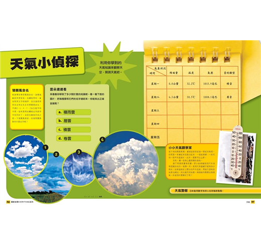天氣對你的生活和周遭世界都有重要的影響,打包好你的雨衣、雪靴和太陽眼鏡,再測試看看自己知不知道風朝哪裡吹。 拿出你的熱情,一起來了解天氣的各種知識吧!