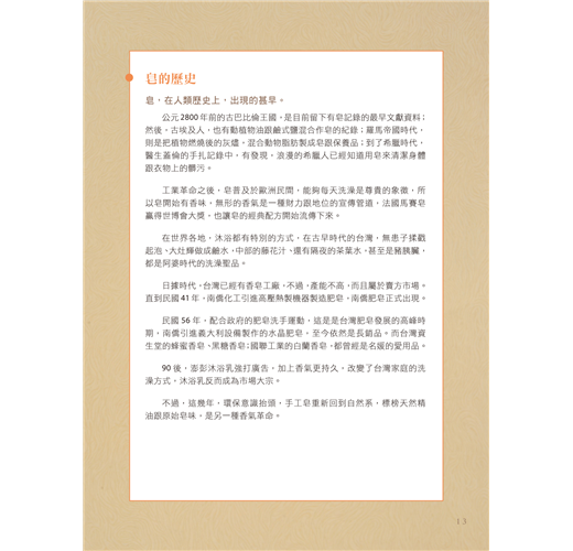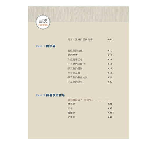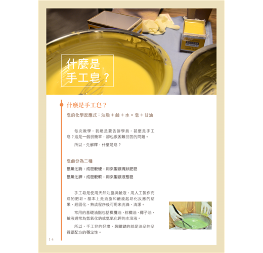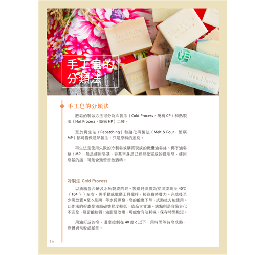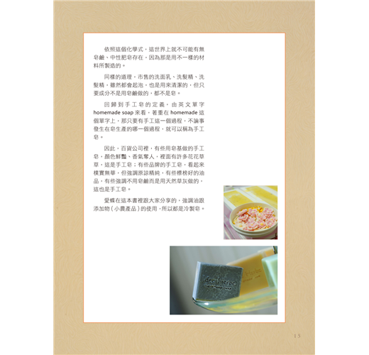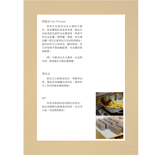 書中理性的部分是,她真的教你如何執行皂的制作,每一種皂的流程,由配方、油品、水量、溶鹼、攪拌、脫模,熟成~交代清清楚楚,也有實作心得,如果你已經是做皂的愛好者,這些資料如同工具書,可有實戰指南的價值。