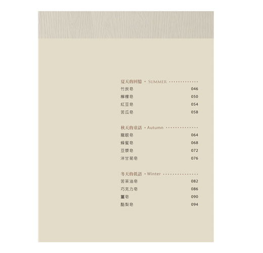 這呼應了她訴說春夏秋冬入皂的心情。竹炭皂,龍眼蜜皂,橄欖油皂,紅豆皂用皂來記憶季節與農作的變化,同時也帶出她發現台灣小農之美的過程。Amber 藉由做皂開發原料的過程,也開發出她對小農的理想國。她用皂為介質,貼近大地傾聽土地的呼吸與讚嘆造物之美!
