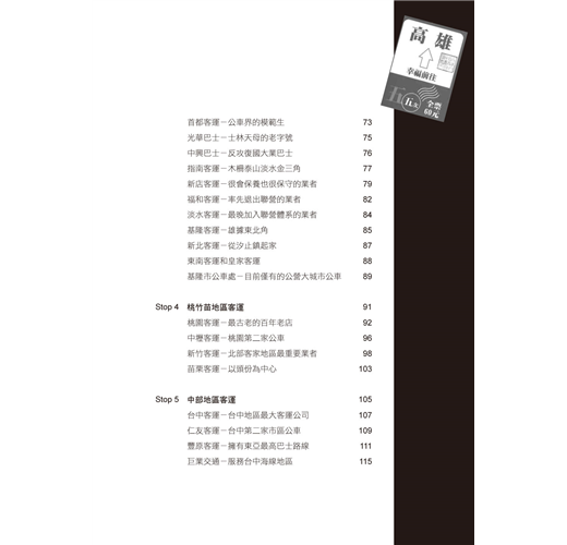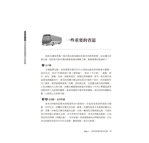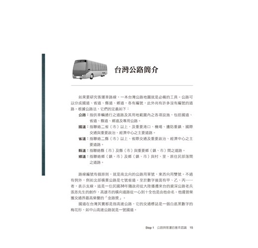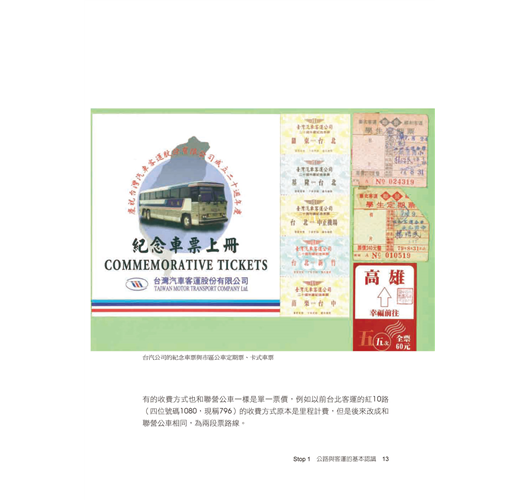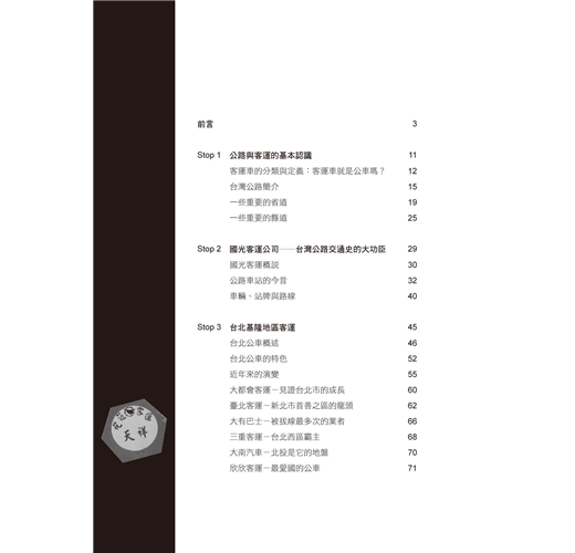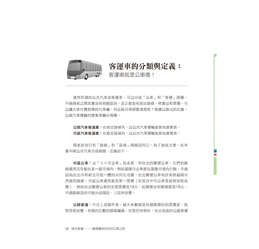 文章經國之大業,不朽之盛事。以上就是本書的寫作目的,希望能將這一點研究成果公諸於世,讓喜歡公車的人不必盲目摸索,本來不喜歡公車的人也喜歡上公車。筆者並非公車迷或公路迷,因此本書沒有深奧的理論,也不談引擎馬力那些機械構造。本書專門介紹歷史較久、較有地域性的客運公司,至於晚近成立的以國道客運為主的業者、除國光客運以外各公司的國道路線則不在本書介紹範圍內。