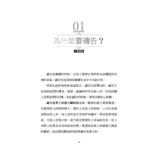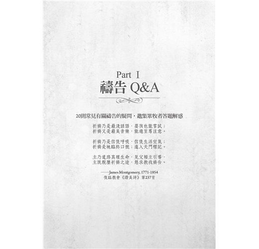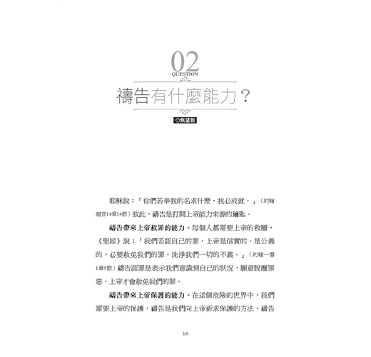 此外,書中還設計了20則「禱告Q&A」和30條基督教「常用名詞解說」兩個單元,邀請牧師回答有關禱告的疑問,盼能幫助初信者和慕道友,更明白禱告的深層意涵並增進有關基督教的知識。