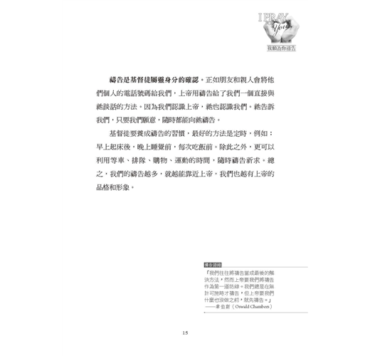 在基督教機構中,禱告是非常重要及普遍的一種語言,不論開會、活動、禮儀甚至用餐前都會禱告,然而這對很多非基督徒或是初信者而言,可能視禱告為畏途。其實禱告是一種心靈的溝通對話,我剛參與基督教活動時,曾經為了隔天要禱告而憂慮,甚至整晚都睡不著覺;一位資深牧者告訴我,禱告就是你和上帝交通的一種方式,不必拘泥於時間、形式、語句的華美或冗長的禱詞,最重要的是一顆真摯的心,求上帝與你同在的力量。多年後想到這樣的教訓,讓我再次想要出版一本幫助非基督徒、慕道友,讓他們也都能喜愛禱告的書,或許在你最不經意的時刻,禱告能給你人生最大的幫助,甚至推己及人;你的禱告也會帶給別人屬靈的信息與安慰,進而幫助你在職場、家庭甚至社會的和諧關係。
