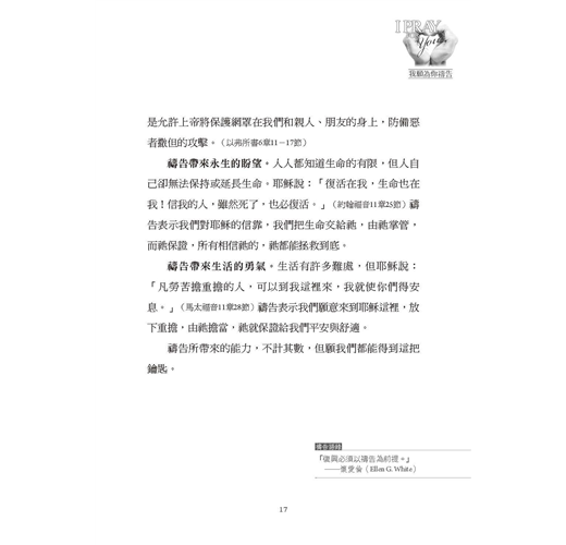 因此,我們企劃製作《我願為你禱告》這本書,讓有這樣經驗的讀者,能夠在任何情境、場合,都能找到適合做為學習禱告的範例。