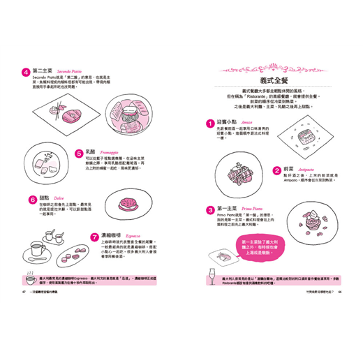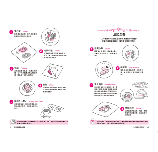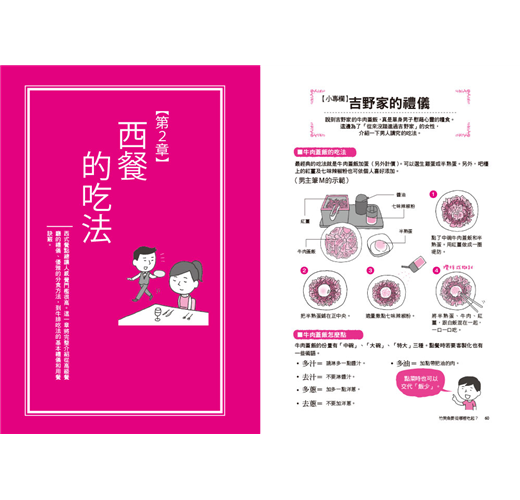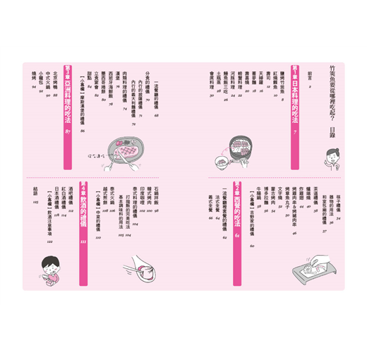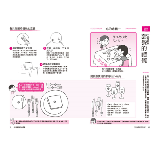 除了日式餐點的禮儀外,其他像是西式餐具的使用順序,以及法式、義式的套餐品嘗順序,到西餐廳應該遵守的規則,以及肉類、魚類菜餚要怎麼吃才正確等等,本書有敘述分享。除此之外,也介紹了中式、泰國、韓國的餐點應該怎麼吃才正確等,內容包羅萬象,讓你對各國飲食文化有更深一層的認識。