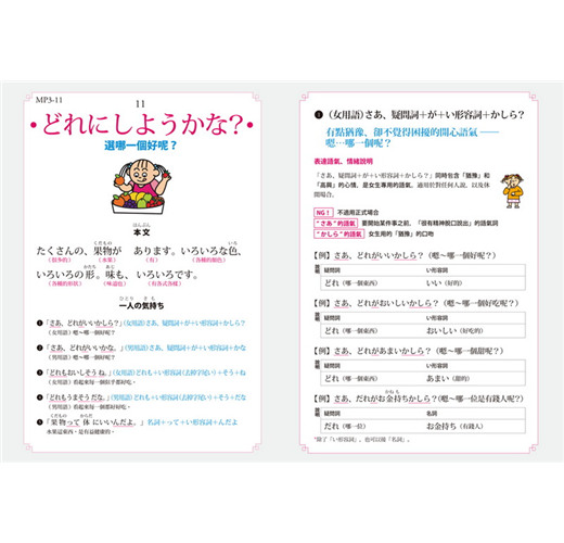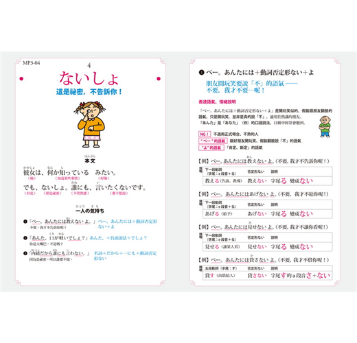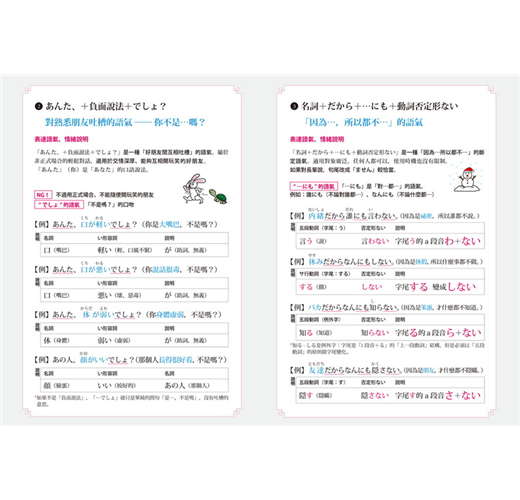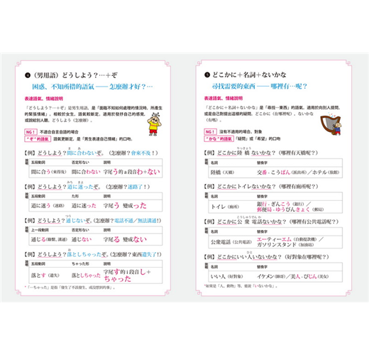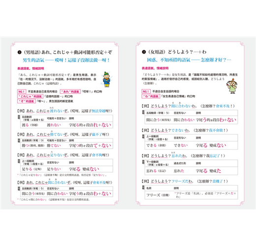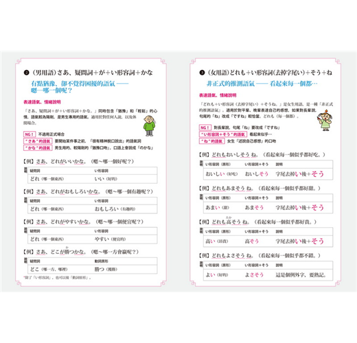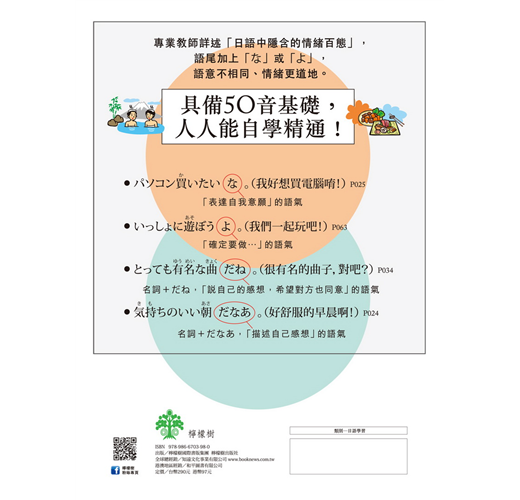 日語有許多放在句尾、表達說話者情感的詞語,類似中文的「吧!」「啊!」「唷!」等,用來傳達說話者的語氣與情緒,有些還區分成「男性用語」及「女性用語」。這些微妙的差異,在書中皆有詳細解說。善用語氣詞,就能完成最簡單、並含有豐富情感的日語表達。