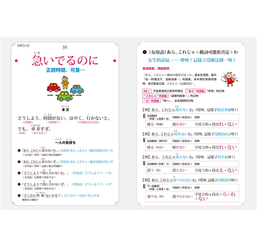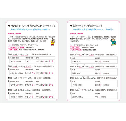 各「構句原則」先說明單字詞性、字尾變化規則、變化過程,並列舉三個新單字、新例句。只要依循原則,掌握文型、套入單字,即能組合出更多句子,完成自我練習,強化日語語感。